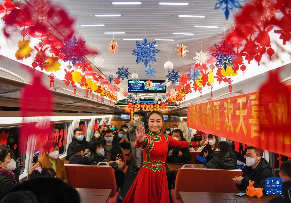 當日正值北方小年,北京開(kāi)往呼和浩特的G2457次復興號列車(chē)被乘務(wù)員們布置得喜氣洋洋。高鐵乘務(wù)員和鐵路烏蘭牧騎隊員們,不僅為旅客奉上一臺精彩演出,還準備了豐富的節日禮品,一路歡聲笑語(yǔ)伴隨著(zhù)乘客。