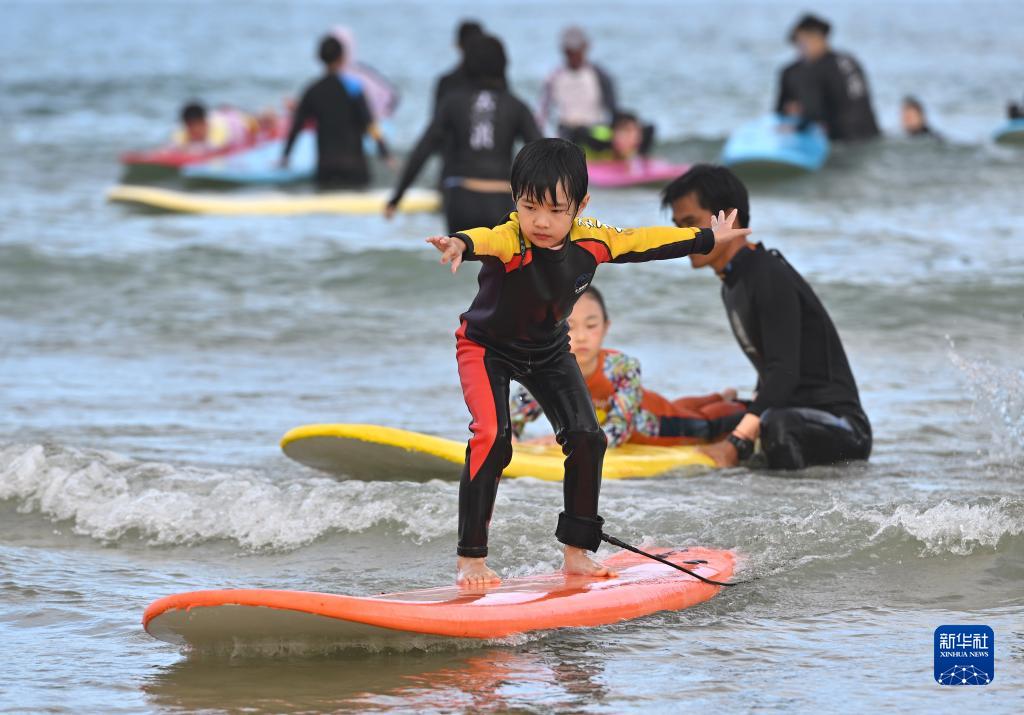 1月13日,小朋友在海南萬(wàn)寧日月灣體驗沖浪。