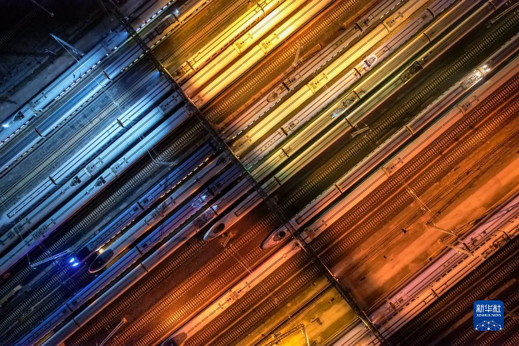 1月7日,2023年春運啟動(dòng)。1月6日晚,在中國鐵路成都局集團有限公司貴陽(yáng)北動(dòng)車(chē)所,??吭诖孳?chē)線(xiàn)上的動(dòng)車(chē)排列整齊如同一支“陸地艦隊”。