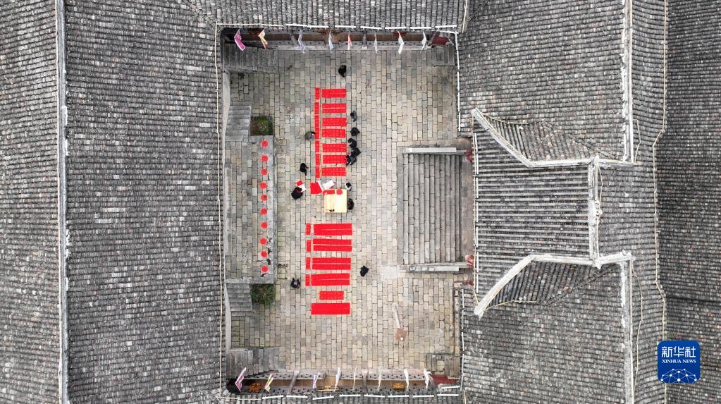 1月12日,在重慶市酉陽(yáng)土家族苗族自治縣龔灘古鎮,居民在寫(xiě)春聯(lián)(無(wú)人機照片)。