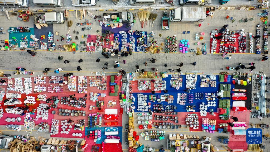 1月14日,人們在賀蘭縣金貴大集上選購年貨(無(wú)人機照片)。