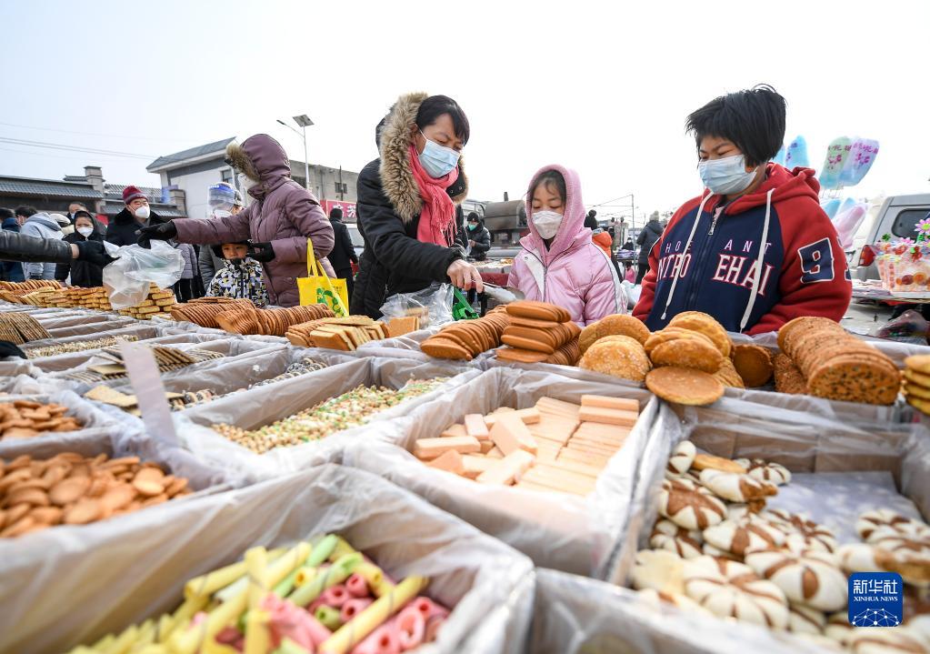 1月14日,人們在賀蘭縣金貴大集上選購餅干。