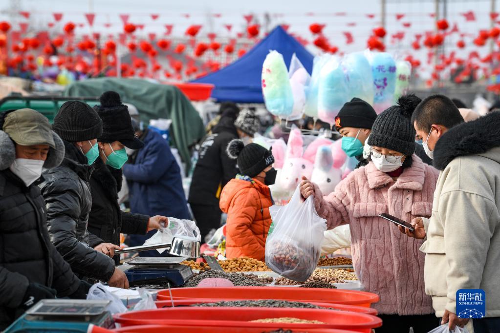 當日是農歷小年,寧夏銀川市賀蘭縣百年鄉村大集金貴大集上貨品琳瑯滿(mǎn)目,洋溢著(zhù)濃濃年味,吸引人們前來(lái)選購年貨。
