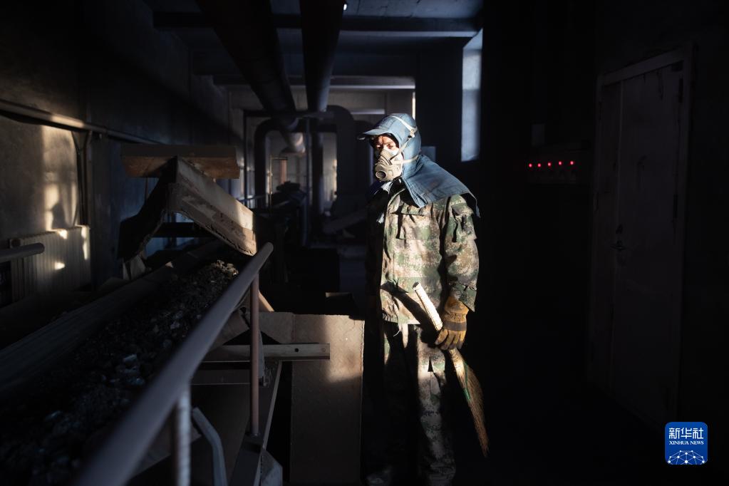 1月13日,工作人員在漠河華美供熱有限公司內監測上煤情況。