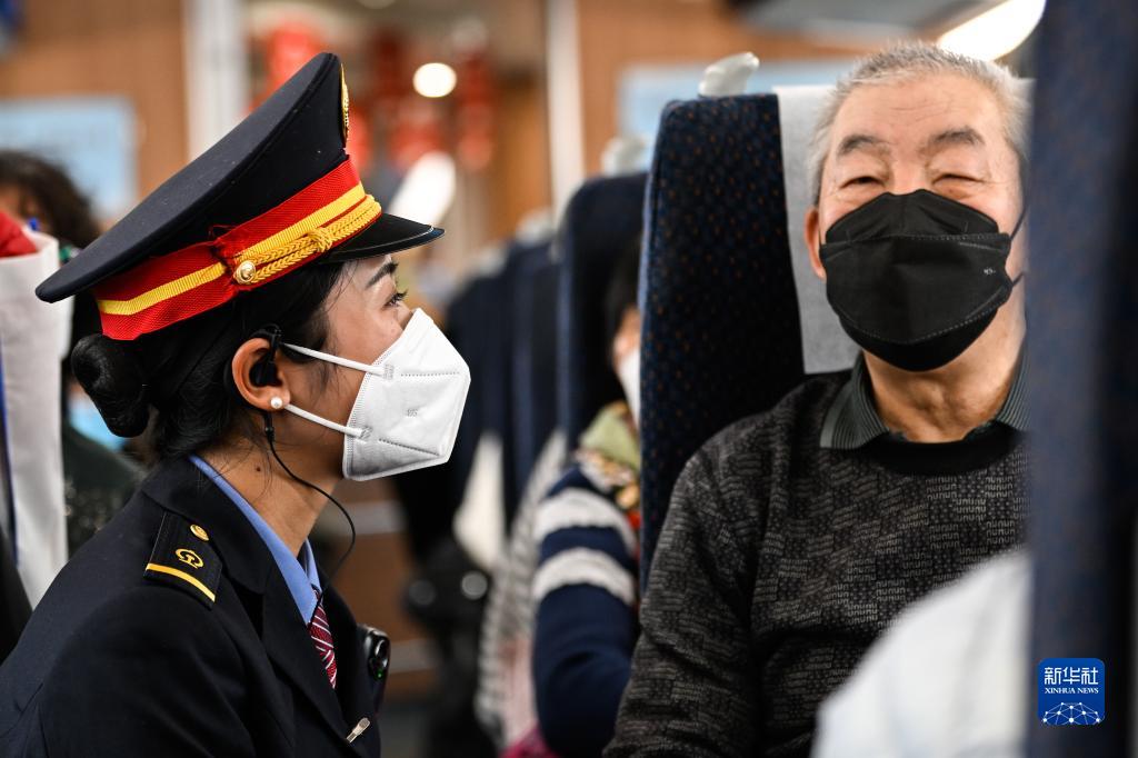 1月11日,在C43次列車(chē)上,阿依布卡(左)和一位旅客交流。