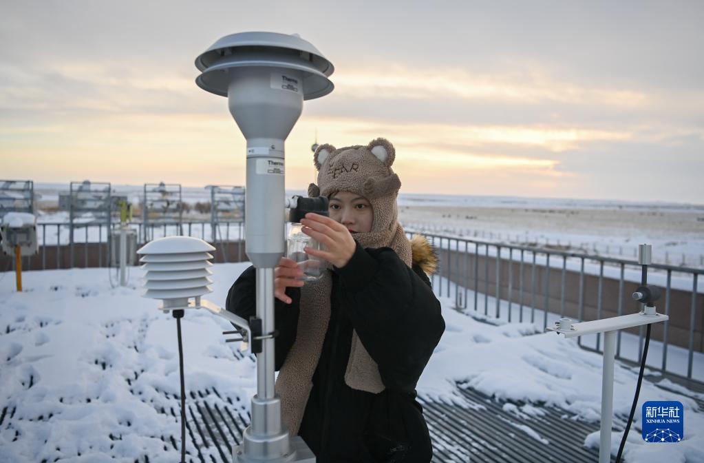 1月8日,阿克達拉國家大氣本底站觀(guān)測員董垠希在屋頂檢查監測設備的雨水分離器。