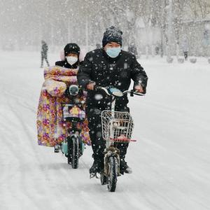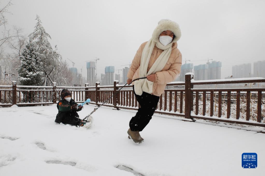 1月14日,市民帶著(zhù)孩子在河南省焦作市溫縣子夏公園冒雪玩耍。
