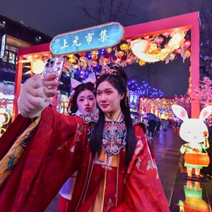 1月14日,游客在南京夫子廟景區拍照留念。