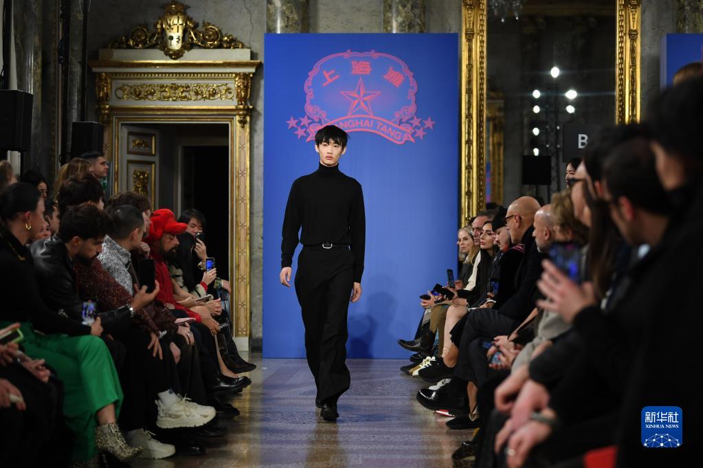 1月14日,一名模特在意大利米蘭男裝周上展示上海灘品牌時(shí)裝。