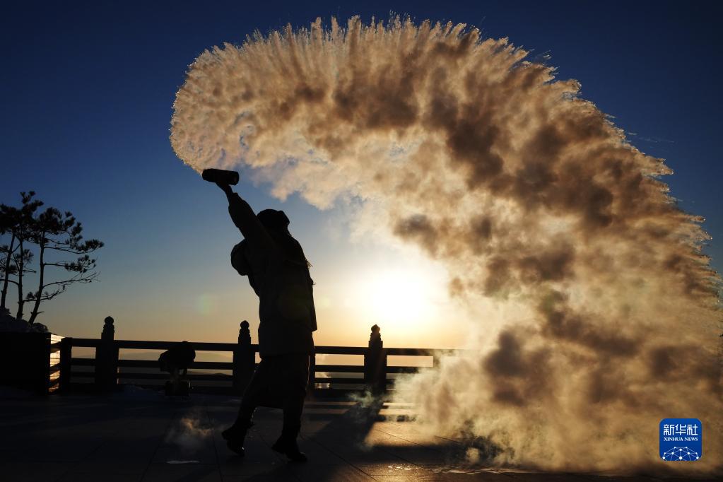 1月14日,在撫遠市東極閣,游客在日出時(shí)玩“潑水成煙”。