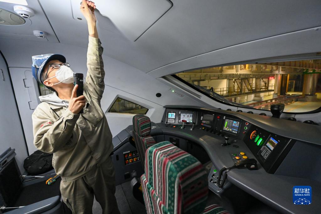 1月14日晚,在烏魯木齊車(chē)輛段動(dòng)車(chē)組運用所,機械師檢查動(dòng)車(chē)組司機室設備。
