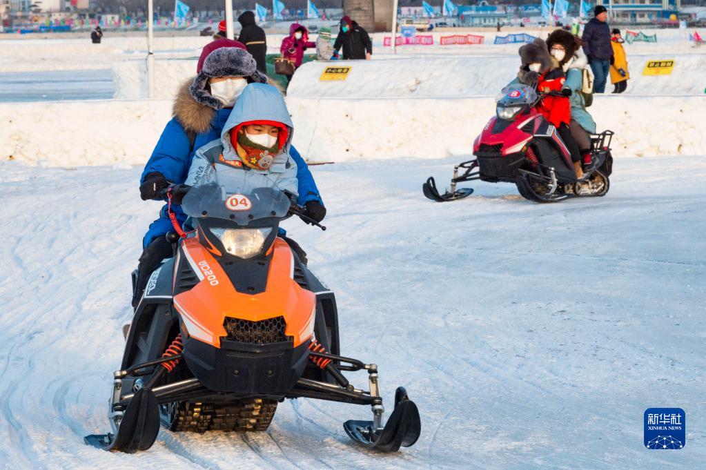 1月14日,游客在哈爾濱松花江冰雪嘉年華園區內體驗冰雪娛樂(lè )項目。