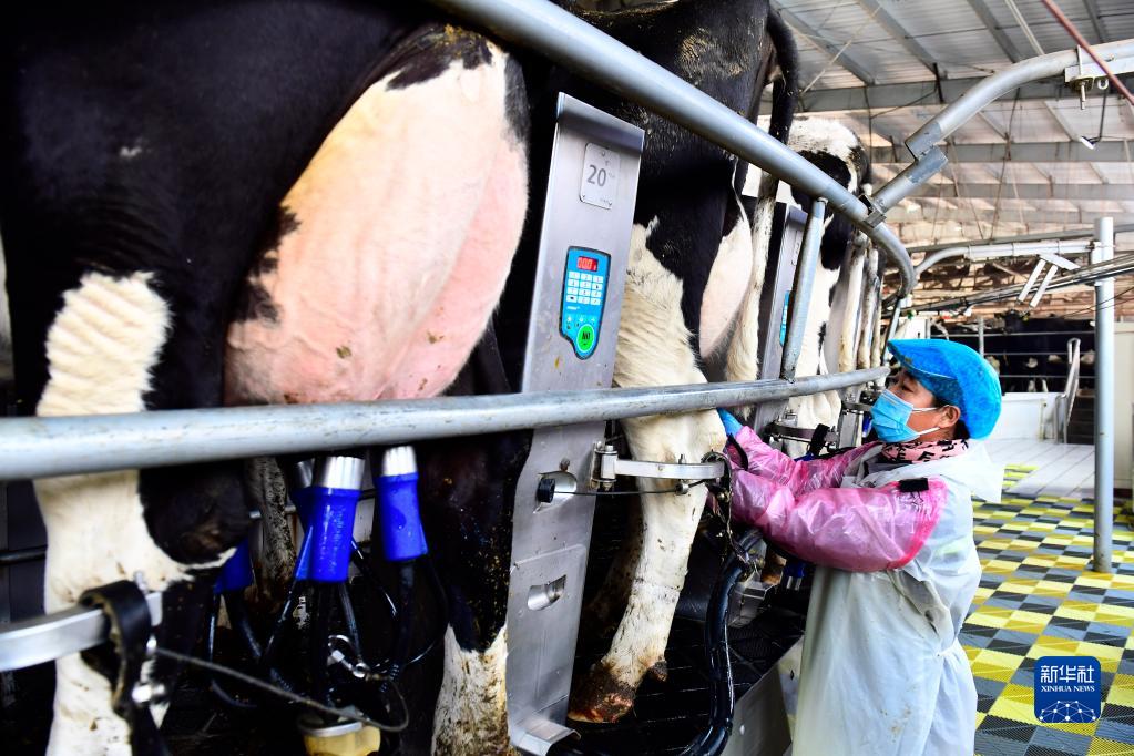 1月15日,在衛崗乳業(yè)日照鮮純生態(tài)牧業(yè)有限公司,工作人員在進(jìn)行擠奶作業(yè)。