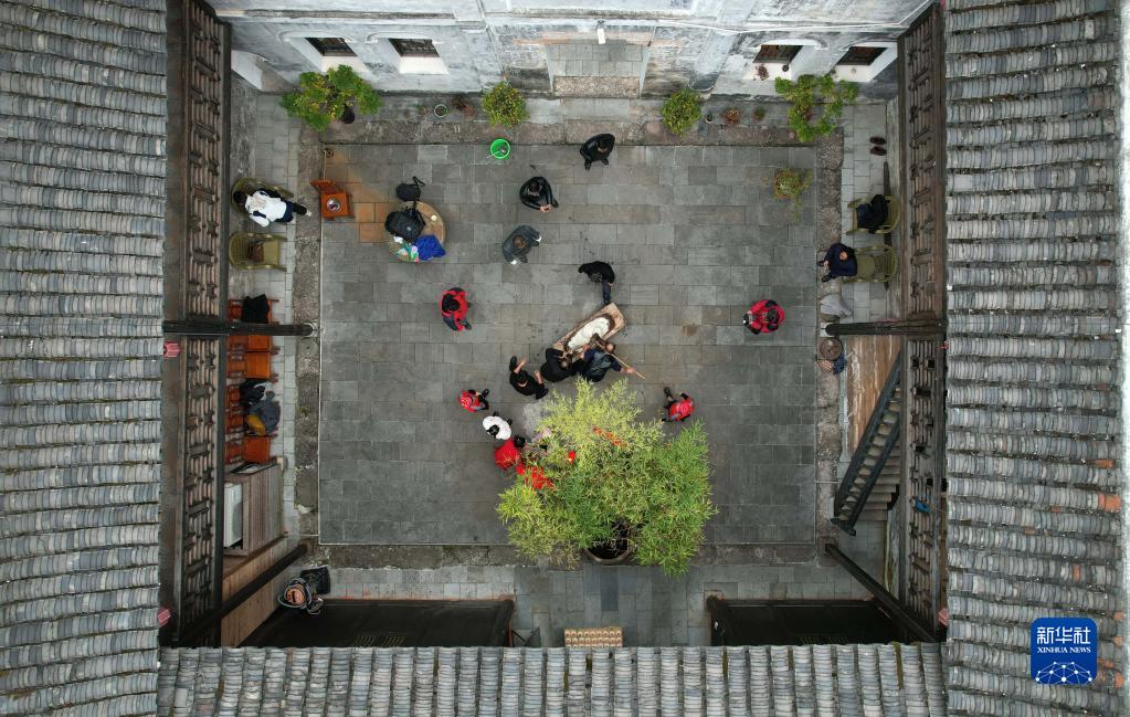 1月15日,在黃平縣舊州古鎮,村民在打糍粑(無(wú)人機照片)。
