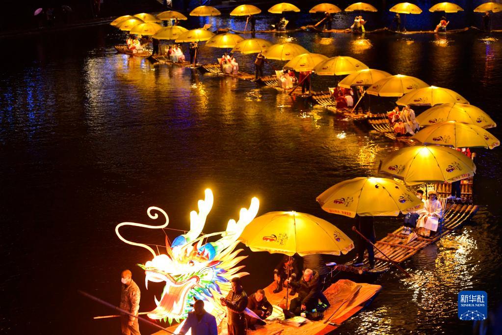 當日,在湖北省恩施土家族苗族自治州宣恩縣貢水河上,一場(chǎng)“貢水游龍”迎新春活動(dòng)吸引不少市民游客參與體驗?!柏曀锡垺庇蓴凳畻l竹筏作“龍身”,輔以燈光、音樂(lè ),人們可以在貢水河上“乘龍”觀(guān)賞璀璨夜景,歡樂(lè )迎新春。