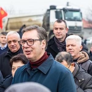 1月14日,塞爾維亞總統武契奇(前中)在塞北部城市諾維薩德附近視察匈塞鐵路諾維薩德至蘇博蒂察邊境段建設工地。