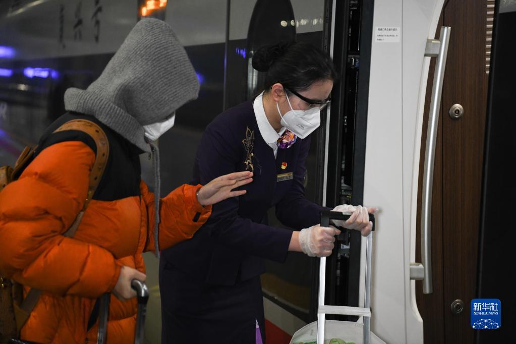 1月14日凌晨,上海虹橋開(kāi)往亳州南的G9480次高鐵列車(chē)??吭诤戏收?,中國鐵路上海局集團有限公司合肥客運段列車(chē)員王昊(右)引導旅客上車(chē)。