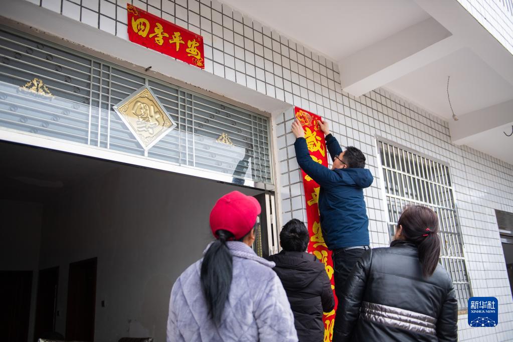 1月15日,在漢壽縣滄浪街道老鸛樹(shù)社區,鄉村振興駐村工作隊隊員程鵬(右二)給脫貧戶(hù)家貼春聯(lián)。