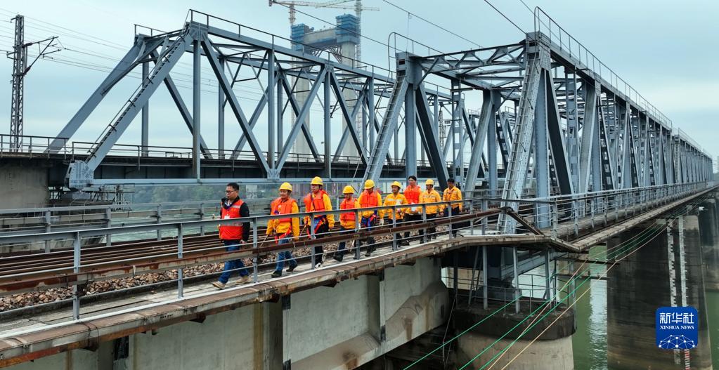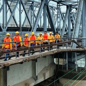 1月14日,在廣西貴港市,陳榮興(左二)、陳龍(左三)和工友們在巡查鐵路郁江橋。