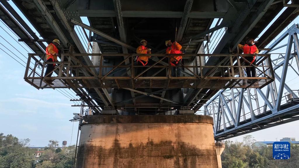 1月14日,在廣西貴港市,陳榮興、陳龍和工友們一起在鐵路郁江橋底部開(kāi)展檢修工作(無(wú)人機照片)。
