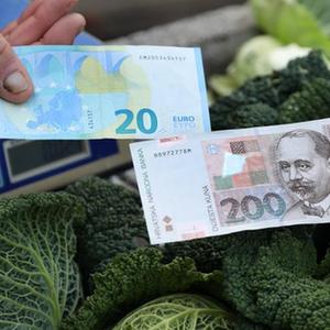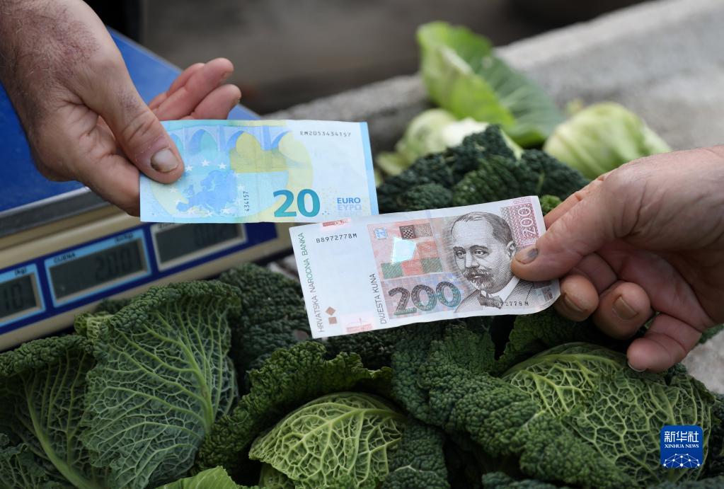 這是1月14日在克羅地亞希貝尼克一處果蔬攤拍攝的庫納(右)和歐元紙幣。