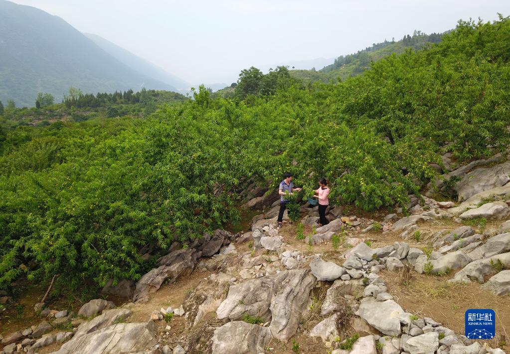 農民在貴州省印江縣朗溪鎮昔蒲村的石漠化治理區采摘桃子(2019年6月26日攝,無(wú)人機照片)。新華社記者 楊文斌 攝