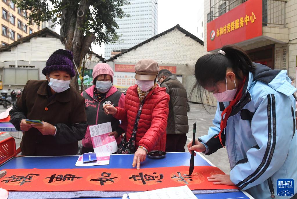 1月16日,在廣西南寧市西鄉塘區新陽(yáng)街道永和村,書(shū)法愛(ài)好者在為群眾寫(xiě)春聯(lián)。