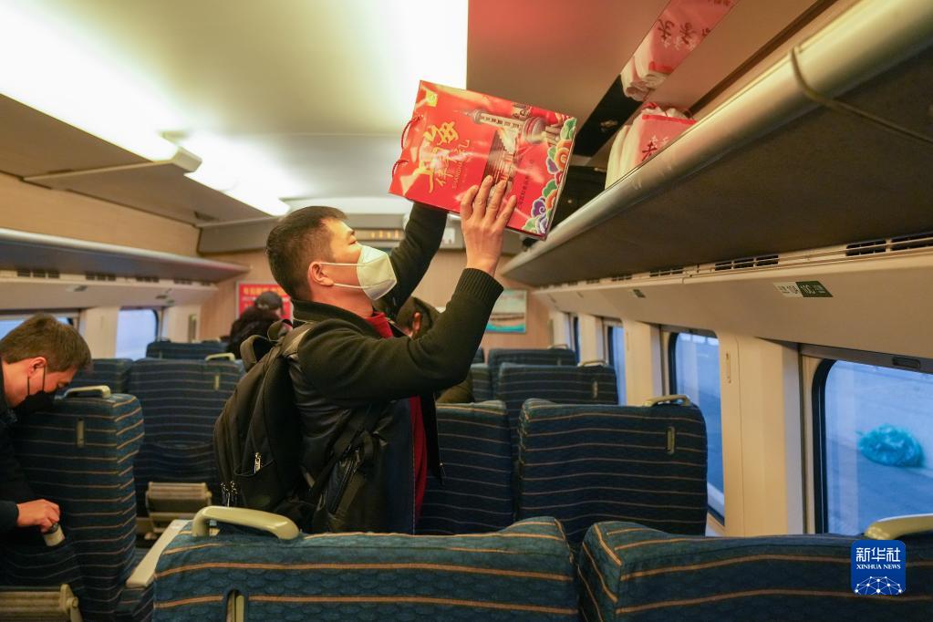1月15日,在上海南站,易生軍將行李放置在列車(chē)行李架上。