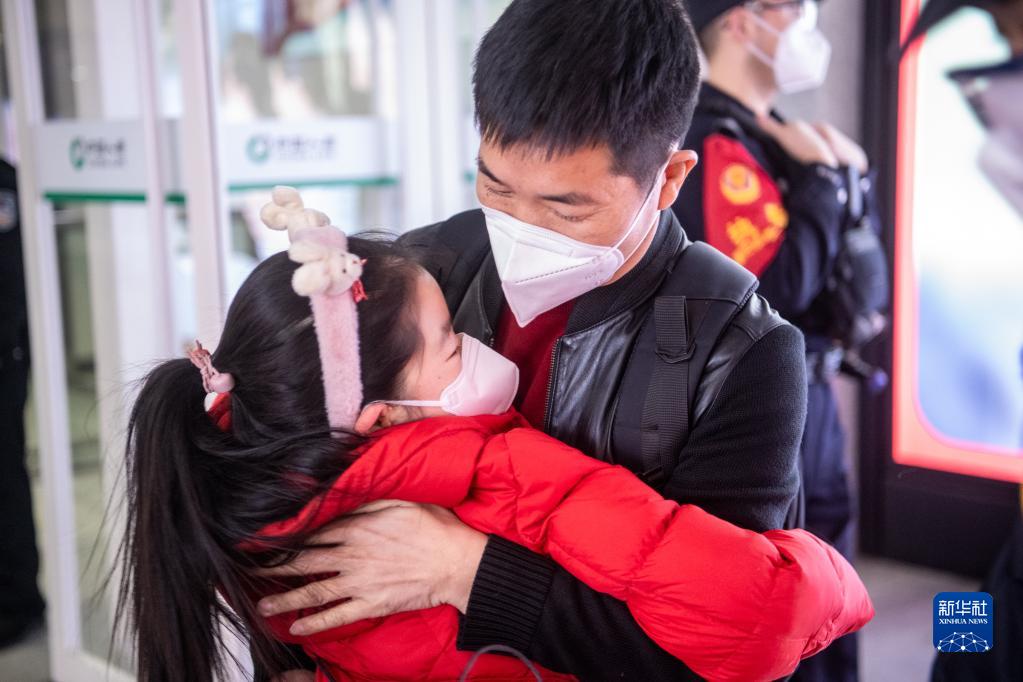 1月15日,在湖北十堰東站出站口,易生軍與前來(lái)迎接的女兒擁抱。