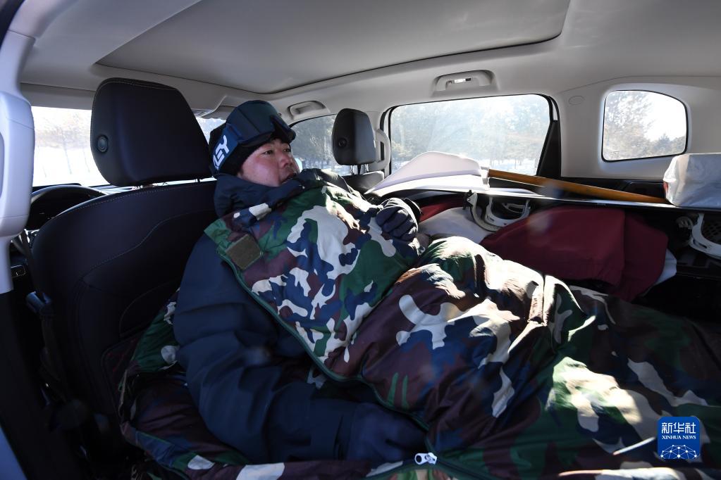 1月15日,滑雪間隙,布赫·巴雅爾鉆進(jìn)車(chē)里的睡袋中保暖。