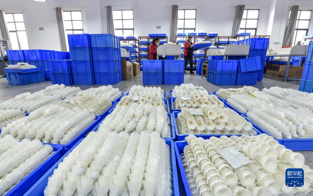 在錦屏經(jīng)濟開(kāi)發(fā)區貴州亞獅龍體育文化產(chǎn)業(yè)發(fā)展有限公司羽毛球生產(chǎn)基地,工人在生產(chǎn)羽毛球(2022年12月19日攝)。