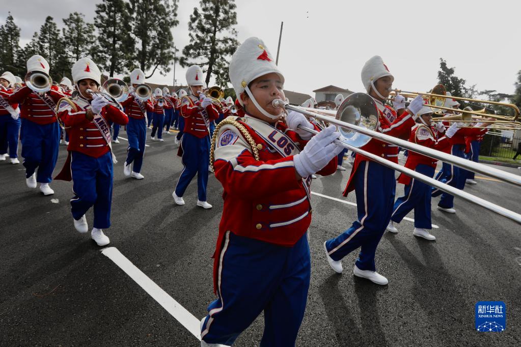 1月16日,在美國洛杉磯,學(xué)生參加馬丁·路德·金紀念日游行時(shí)吹奏樂(lè )器。