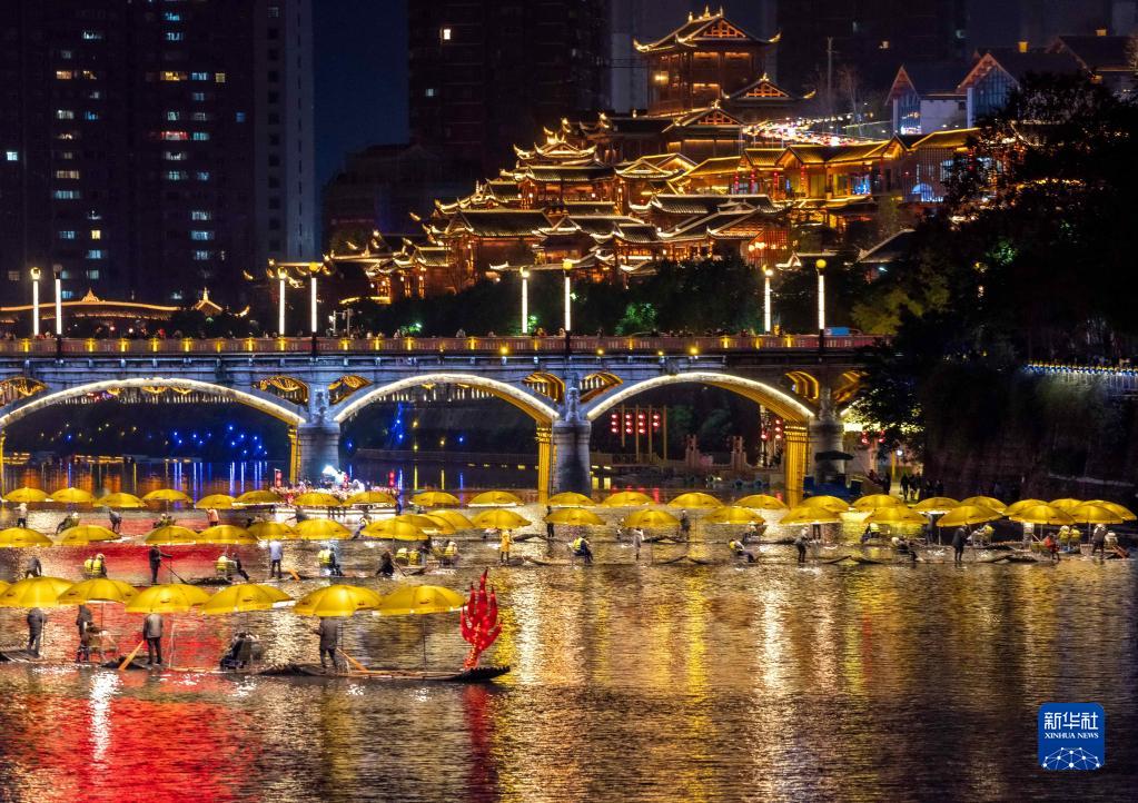 1月16日晚,游客乘坐竹筏在湖北省宣恩縣城貢水河上游玩。