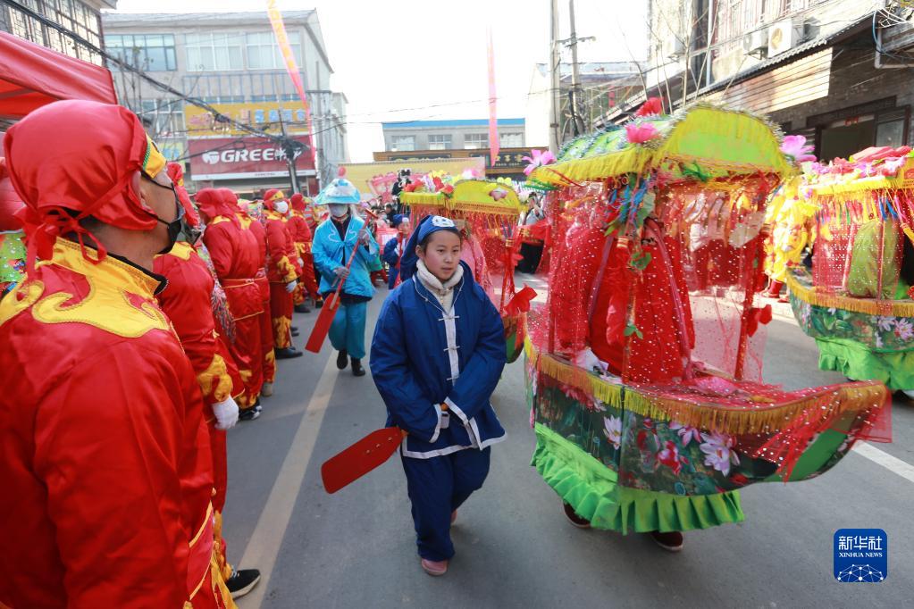 1月17日,在濉溪縣臨渙鎮,民俗藝人在表演劃旱船。