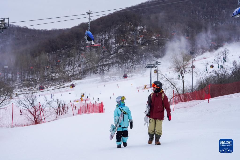 都軒銘(左)和父親都宇走在吉林市萬(wàn)科松花湖度假區滑雪場(chǎng)內(2023年1月14日攝)。