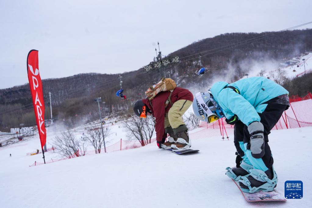 都軒銘(右)和父親都宇在吉林市萬(wàn)科松花湖度假區V-PARK地形公園準備滑雪(2023年1月14日攝)。