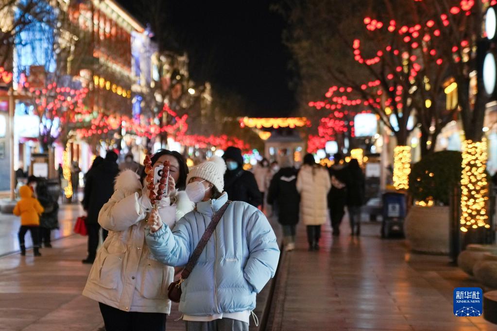 游客在懸掛春節燈飾景觀(guān)的前門(mén)步行街休閑(1月15日攝)。