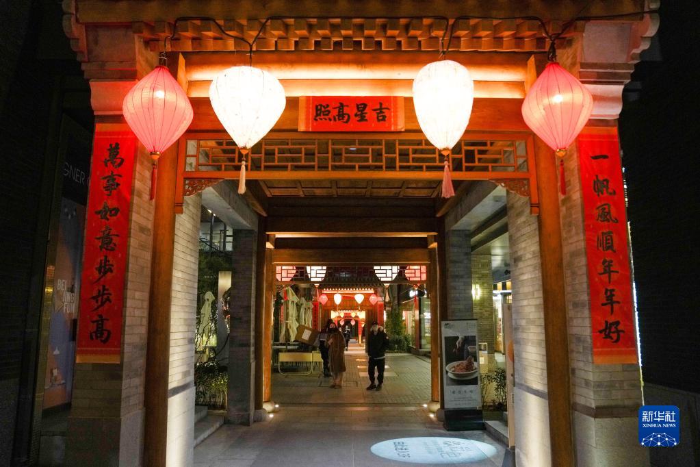 游客在懸掛春節燈飾的北京坊商業(yè)區參觀(guān)游玩(1月15日攝)。