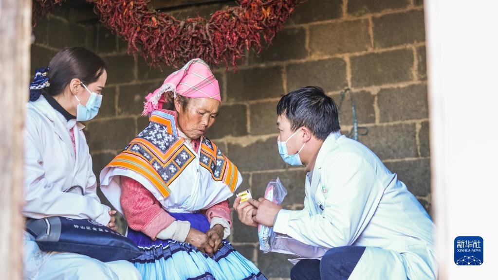 醫務(wù)工作者到六盤(pán)水市鐘山區金盆苗族彝族鄉雙塘村村民家中巡診送藥(1月6日攝)。