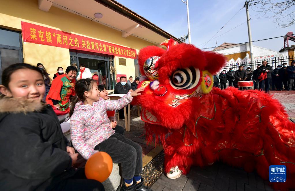 1月17日,在山東省聊城市茌平區菜屯鎮鳳凰新村,小朋友同舞獅表演進(jìn)行互動(dòng)嬉戲。
