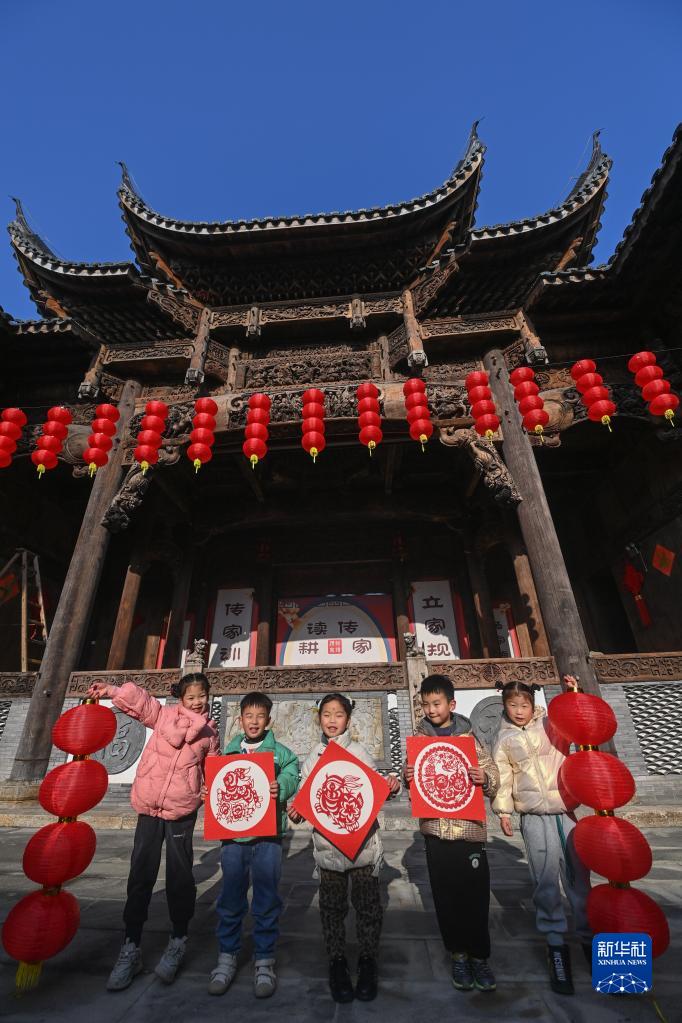 1月18日,在長(cháng)興縣李家巷石泉村的古建筑“百桌廳”內,孩子們在展示各式各樣的兔年剪紙。