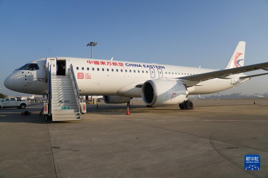 東航首架C919停在上海虹橋機場(chǎng)停機坪上(1月9日攝)。