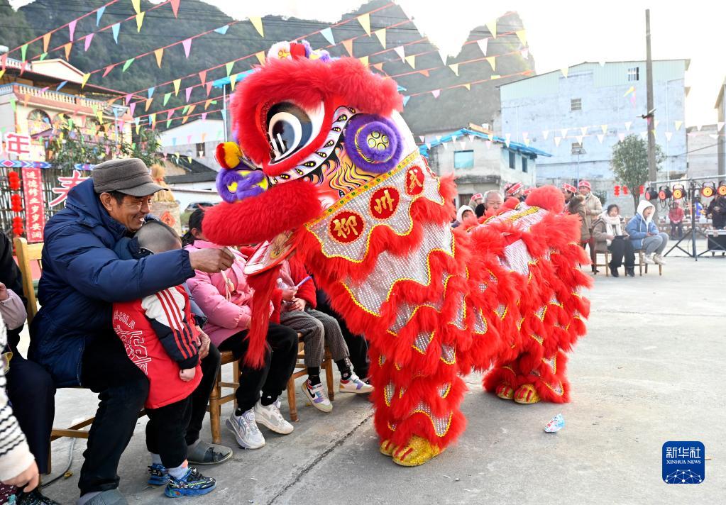 1月17日,村民在“村晚”活動(dòng)上與舞獅表演者互動(dòng)。