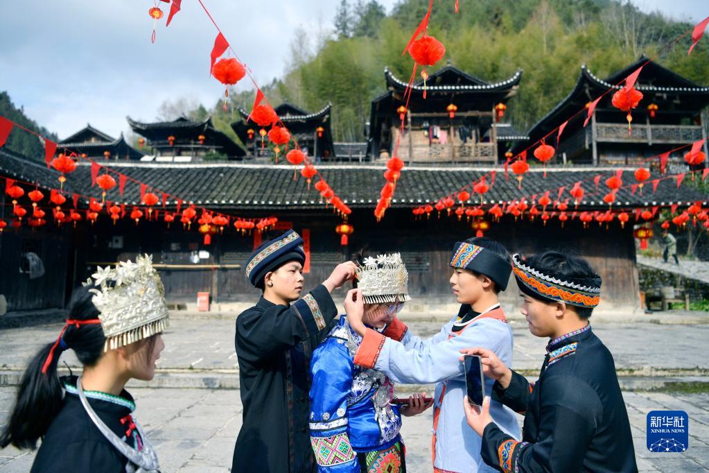 1月18日,在湖北省宣恩縣沙道溝鎮彭家寨吊腳樓前,游客換上土家族傳統服飾游玩。