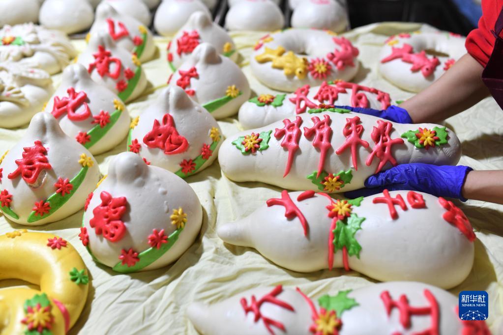 這是在山東省青島市城陽(yáng)區紅島街道觀(guān)濤社區拍攝的居民制作的傳統花饃,花樣別致的花饃寓意美好生活“蒸蒸日上”(1月17日攝)。