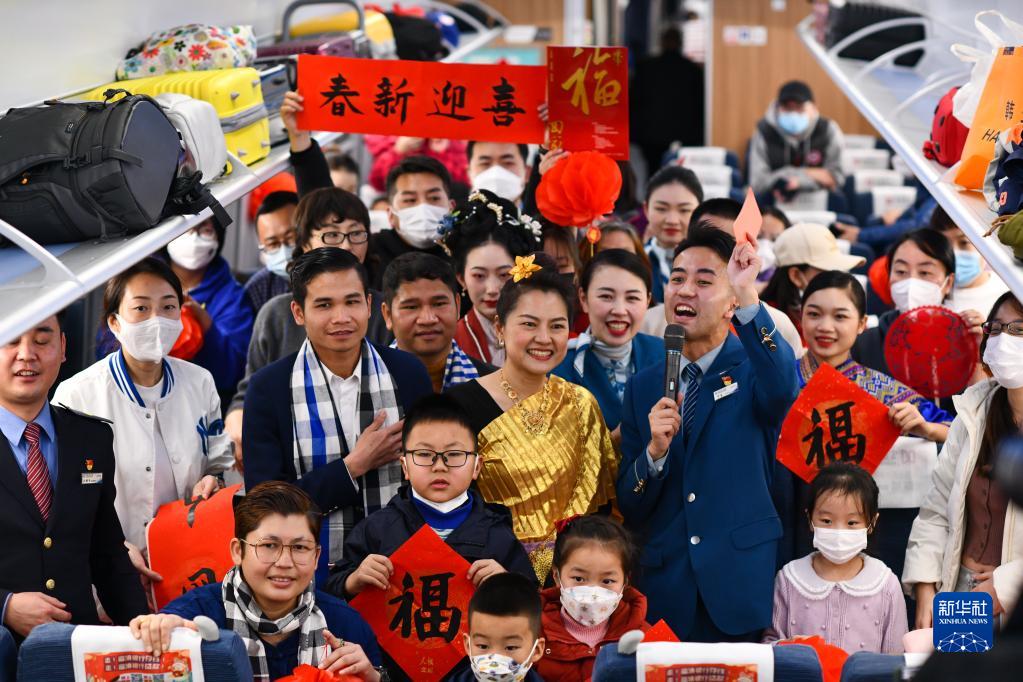 當日,奔馳在中老鐵路上的C272次列車(chē)車(chē)廂內,一場(chǎng)以“中老一家親,祥和中國年”為主題的列車(chē)春晚精彩上演。