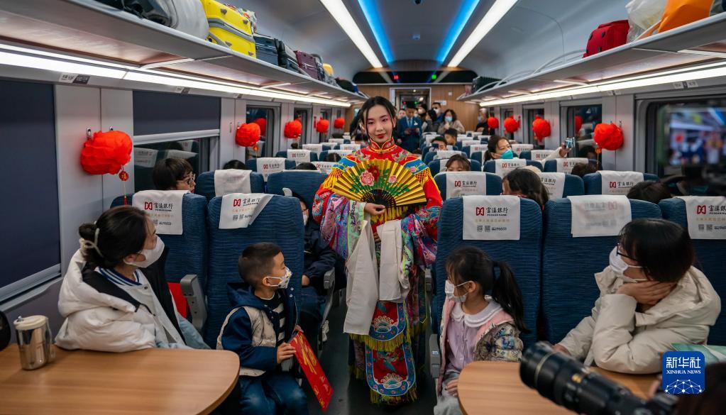 1月19日,京劇演員在車(chē)廂內表演《貴妃醉酒》選段。