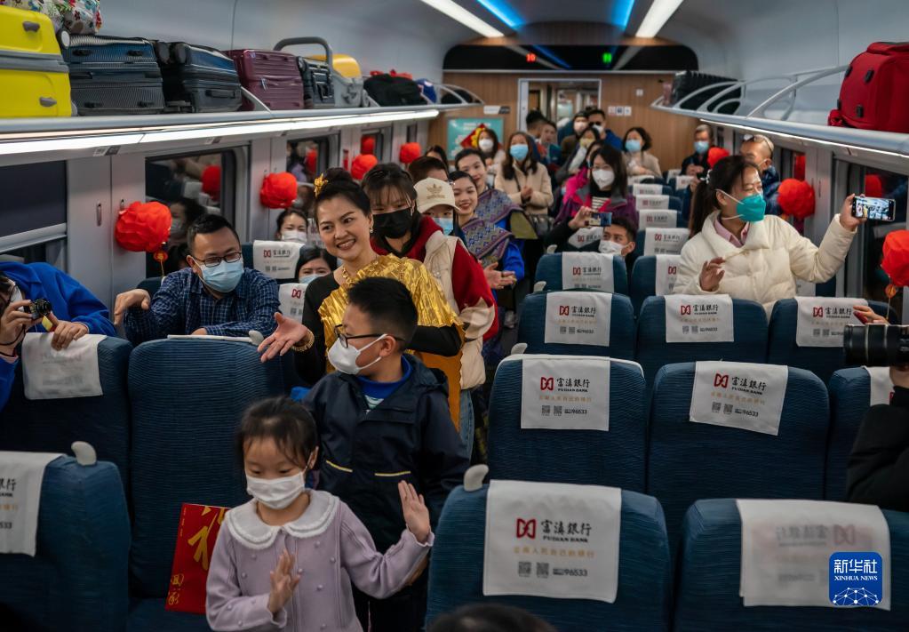 當日,奔馳在中老鐵路上的C272次列車(chē)車(chē)廂內,一場(chǎng)以“中老一家親,祥和中國年”為主題的列車(chē)春晚精彩上演。