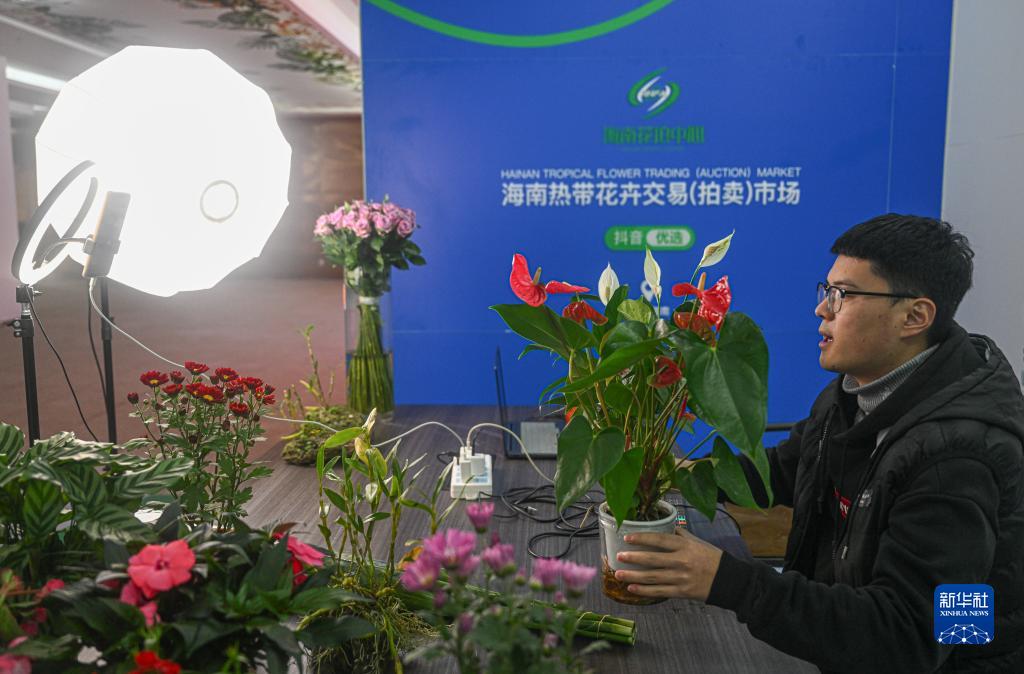 1月18日,在海南熱帶花卉交易(拍賣(mài))市場(chǎng),該市場(chǎng)抖音電商運營(yíng)團隊的主播在直播介紹熱帶花卉。
