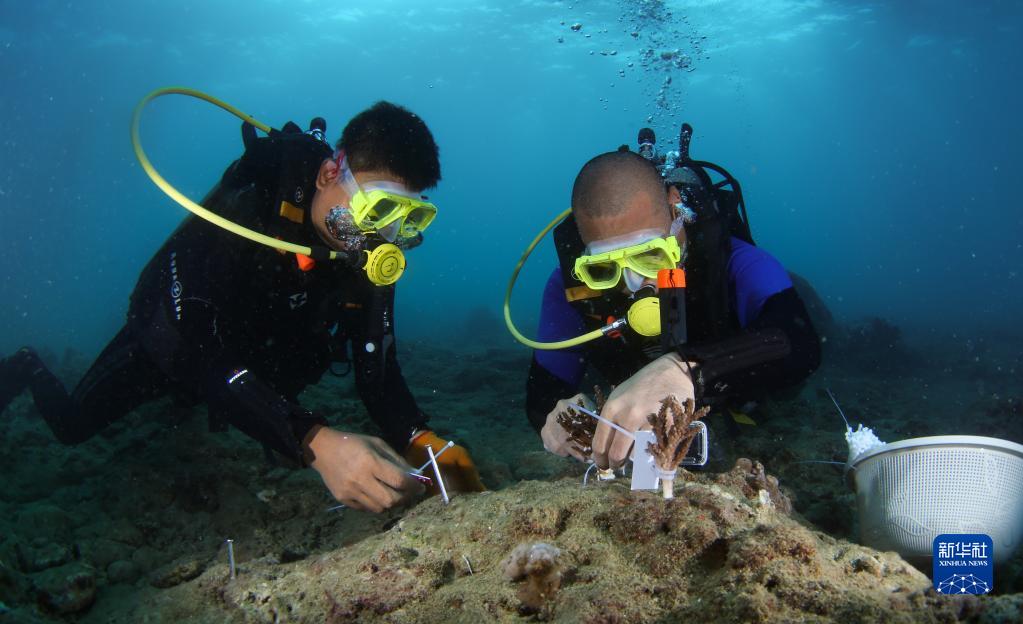 在海南省三亞市亞龍灣相關(guān)海域,潛水員在海底移植珊瑚(2022年11月17日攝)。